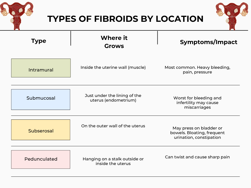 Things you need to consider are the size, number (that is, how many are they), location, and impact. Where the fibroids are located affects your uterus, other organs, and symptoms. Check below size chart and location table to understand deeper.