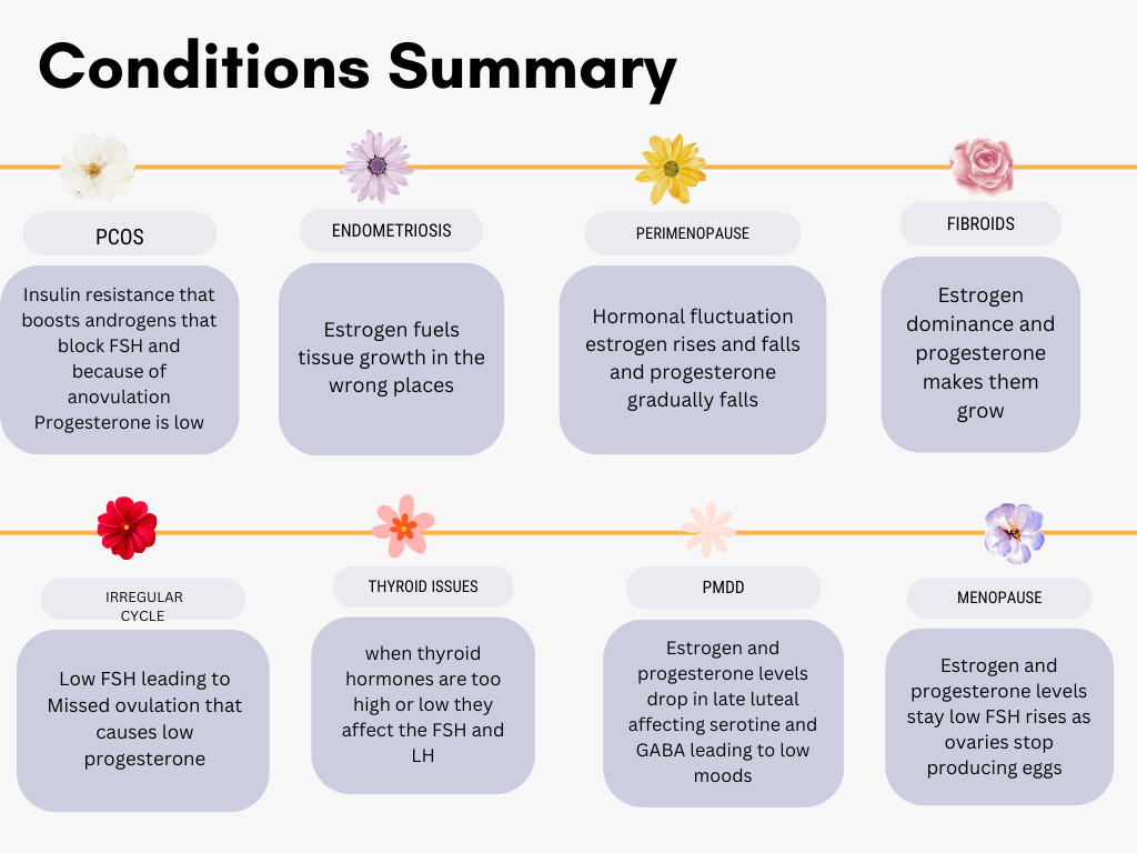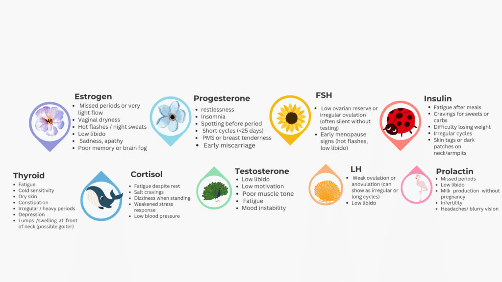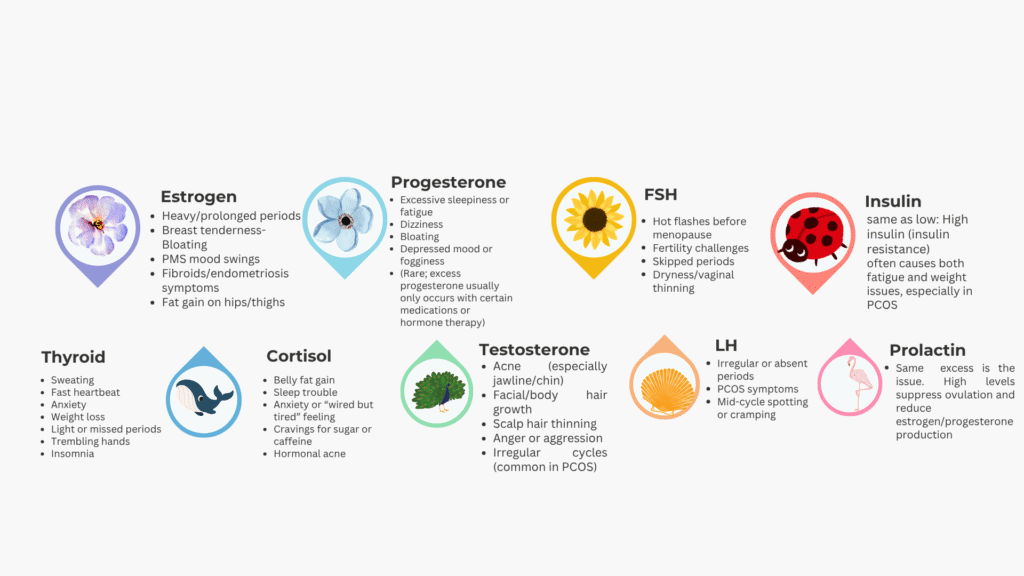 For the symptoms, they usually don’t appear alone. It happens in clusters that form consistent patterns. Also, you can experience imbalances in more than one hormone, for example, low progesterone and high estrogen during chronic stress or a sluggish liver. See below symptoms and what it is likely the cause hormone