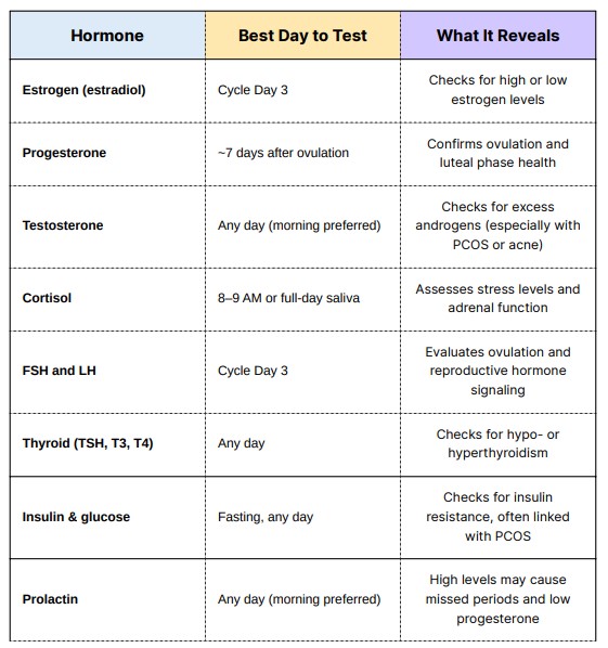 Ladies now how do you tell which hormone is imbalanced, the most accurate way is hormone testing in a medical facility. Note that this depends too on the day of the cycle. See the table below that gives you a good summary of the hormone tests.