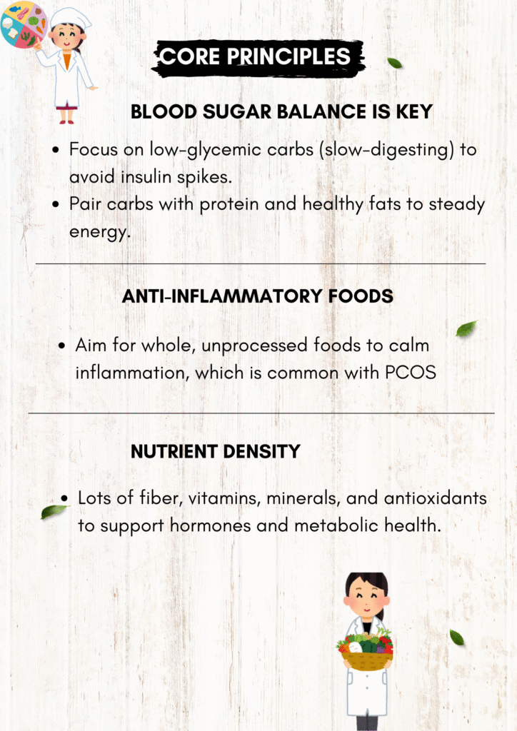 When it comes to PCOS diet the core principles to always keep in mind are below